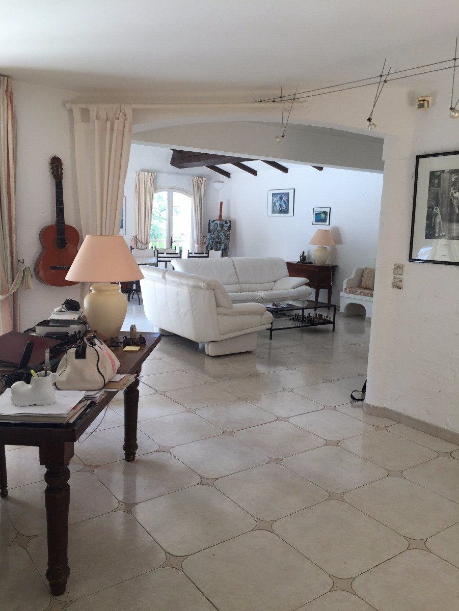 Exclusivité, Fréjus, en limite des golfs de Valescure, au calme absolu, dans un petit domaine, villa sur 3 niveaux de 264m², 6 pièces comprenant un double salon de 58m² avec cheminée, 4 chambres dont une suite parentale sur le toit avec sa tropézienne , 2 bains, 3 douches, 3 wc, belle cuisine indépendante équipée de 17m², un sous sol avec cave, double garage et buanderie, terrain de 1191m² avec cuisine d'été, piscine,